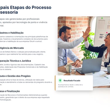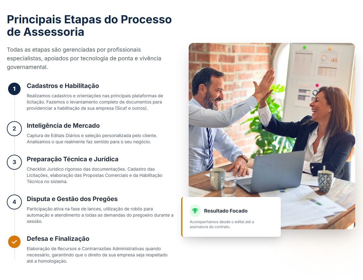 Todas as etapas do processo licitatório são gerenciadas por profissionais especialistas, preparados para a nova lei de licitações (Lei No. 14.133), apoiados por tecnologia de ponta e com muita vivência em vendas e relacionamento para o Governo nas Esferas Municipais, Estaduais e Federais.