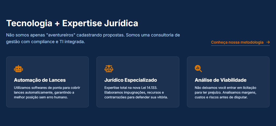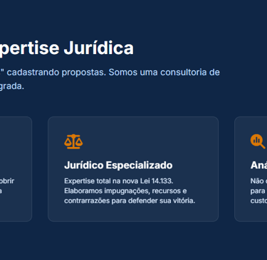Assessoria completa em licitações: da blindagem jurídica à disputa automatizada. Vença pregões sem burocracia e com segurança técnica.